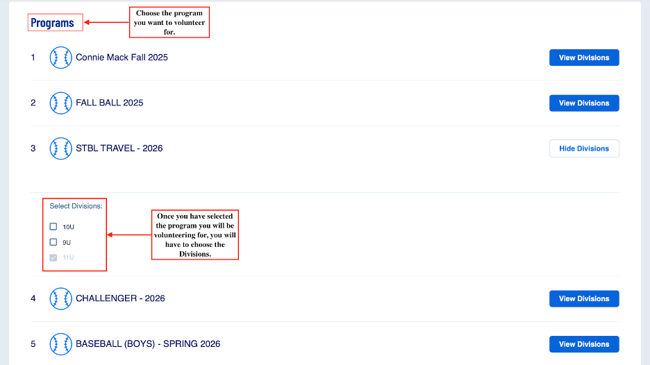 STEP 3: Choose the program and division you will be volunteering for.