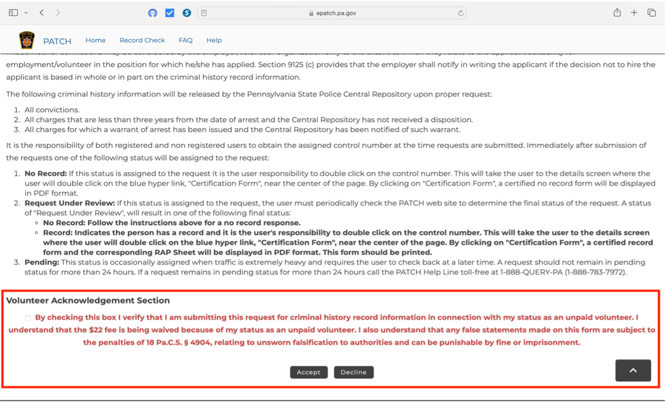 STEP 3: Volunteer Acknowledgement Section: Check the box and then click Accept.