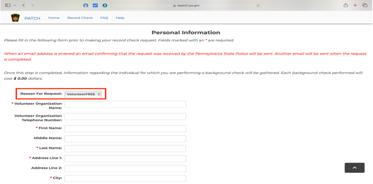 STEP 4: Fill out the Personal Information. Make sure the Reason For Request is VolunteerFree. (Volunteer Organization: Cheltenham Little League)