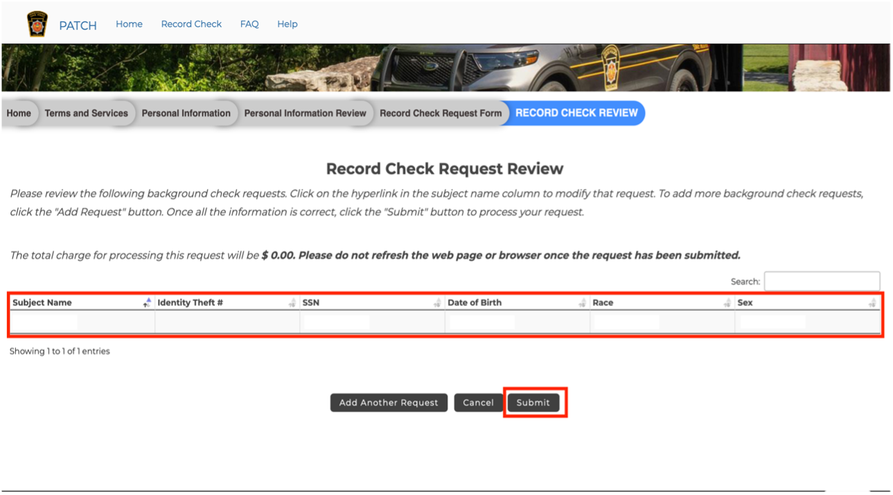 STEP 5: After filling out the Personal Information, you then will be taken to the Record Check Request Review. Once you have submitted all the required information, you can then submit the information.