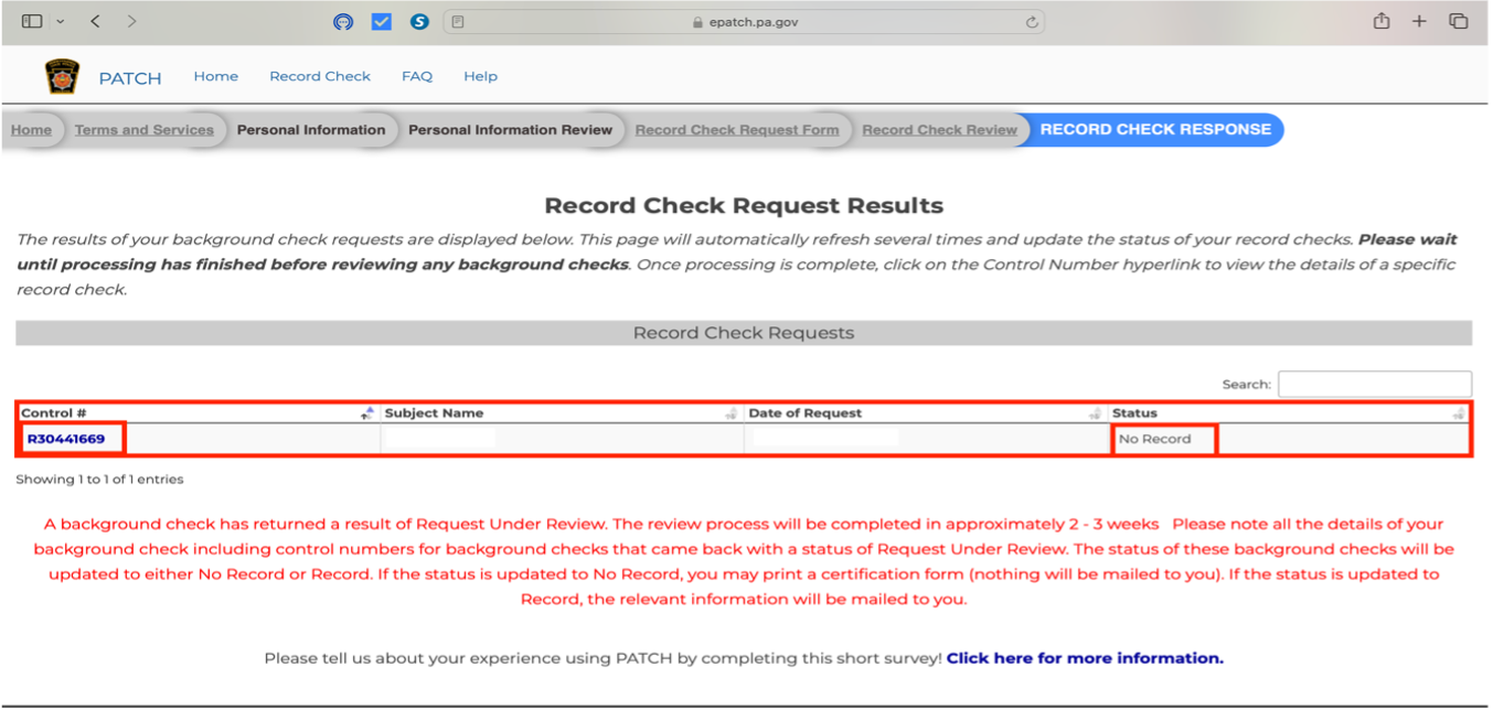 STEP 6: After submitting your Record Check Request, you will get your Record Check Request Results. Make sure to make a note of your Control # and Date of Request.