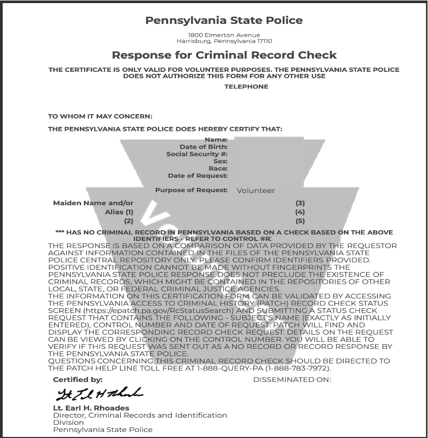 *** THE PENNSYLVANIA STATE POLICE CRIMINAL BACKGROUND HISTORY IS GOOD FOR 5 YEARS FROM THE DATE OF REQUEST. ***